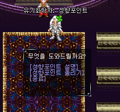 성당에 도착했다면 ( 성향포인트 )라고 채팅 창에 입력하도록 하자. 성향 포인트 올리기를 선택하면 아래와 같은 화면을 통해 원하는 성향에 포인트를 분배할 수 있다.