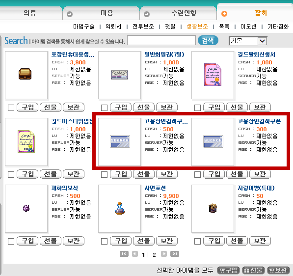 우선 캐시샵에가서 고용상인검색쿠폰을 사도록 하자. 각각 500원, 300원 짜리가 있다. 꼭 500원 짜리를 사도록 하자. 500원짜리는 1일 동안 이용이 가능하지만 300원 짜리는 1회 이용이 가능하다. (자신이 속해 있는 맵에 원하는 물품이 없다면 다른 맵도 검색을 해야하는데 1회 이용가능한 쿠폰을 산다면 또 다시 고용상인검색쿠폰을 구매해야한다.)