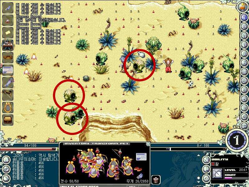 빨간 동그라미 친 녀석들이 바로 캑터스(로드) 이다. 정말 4~5시간은 사냥한 것 같은 느낌이다. 그나마 다행인 것은 이곳에서 매크로를 사용중이던 분이 계셔서 밑에 떨어진 아이템들 속에 파묻혀 있는 가시를 열심히 주워 먹을 수 있었다.