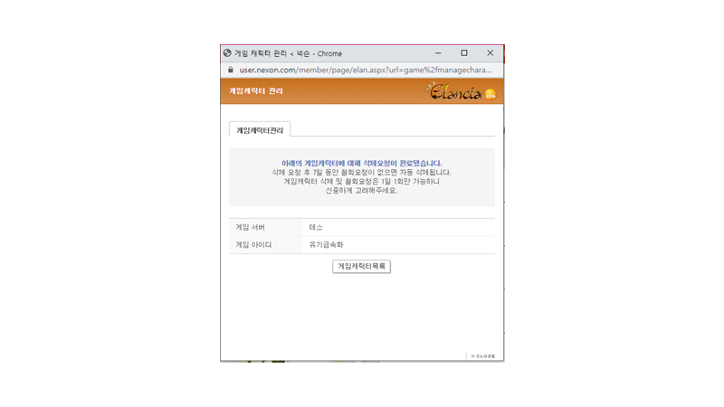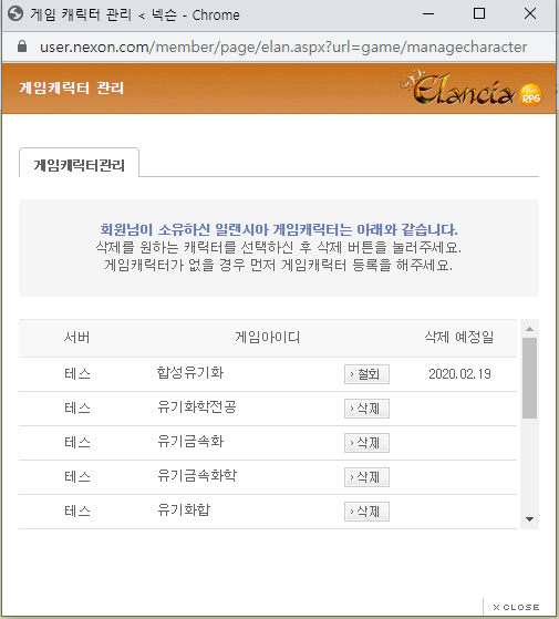 클릭하면 서버와 아이디 그리고 삭제 버튼이 생성된다. (위 삭제 예정일은 지난번에 삭제를 신청한 캐릭이다.)