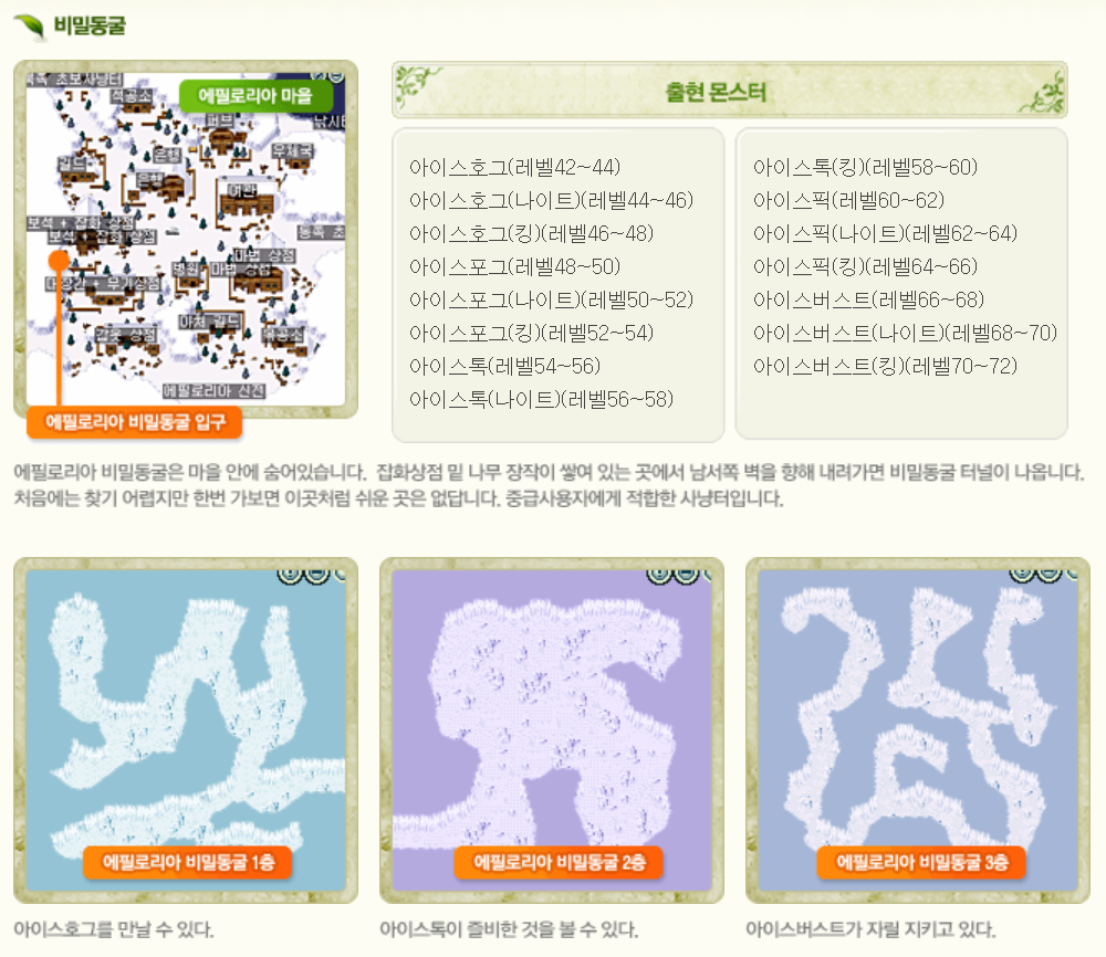 일랜시아 공식 홈페이지에 따르면 에필로리아에는 숨겨진 비밀 동굴이라는 곳이 있다고 한다. 몬스터 레벨 대를 보니 Lv42~72까지 다양하게 분포하고 있다. 그리고 입수한 정보에 따르면 3층에 존재하는 아이스버스트를 잡으면 버스트주머니를 획득할 수 있는데 이를 통해 [그레이드]에 필요한 정령의 보석을 획득할 수 있다고 한다.