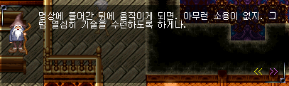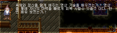 명상은 육체와 정신을 맑게 해주는 기술이라고 한다. 자신의 마력을 빠르게 회복시킬 수 있다고 한다. 위 목적으로 사용하지는 않을테지만 악사 잡포를 빠르게 채우고 몸렙을 올리기 위해 꼭 배워야 하는 기술이다.