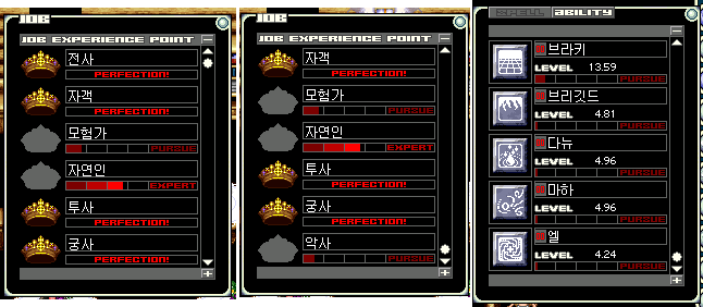 현재 상황은 위와 같다. 전사, 자객, 투사, 궁사를 잡마하였고 모험가 잡포 20, 자연인 잡포 70을 뽑아놓은 상태이다. 이후 악사 잡포 50, 네크 잡마 후 음유, 정술 잡마 그리고 상인 잡마를 할 예정이다. 뭐.. 오래 걸리더라도 여름 전에는 할 수 있지 않을까 하고 생각한다.